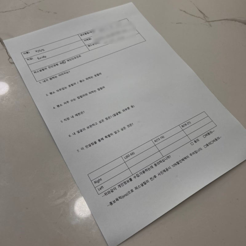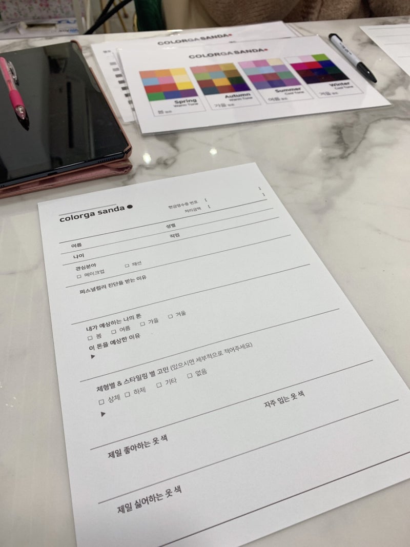 요즘은 의상뿐만 아니라 액세서리도 톤에 맞게 착용하는 거 다들 아시죠?악세사리 하나라도 놓칠 수 없지!그리고 여기는 이안컬러랩 자체제작 퍼스널컬러톤표가 따로 있어서 티켓도 따로 선물해주신대요~ 이걸 증정해주시는게 아니라~ 나중에 증정해주실 티켓은 아래를 참고해주세요짜잔!그 중앙에 앉아 거울을 보고진단을 받습니다. 두근 두근 설레이는 절반~ww과연 나는 어떤 색인지! 그리고 한명에게 4명까지 다수에서 개인 컨설팅이 가능 하지만 동시 컨설팅하면 조금 더 할인해서 주는 이벤트도 있다고 들었습니다.함께 들으면 사장과 단둘이 있는 것보다 어색하지 않고 마음도 편하고 가격도 좀 더 싸고 ww일석 이조 같아요. 친구가 없는 민 쥬리는 혼자 방문^^..이렇게 벽에도 미세한 톤이 나누어져 있습니다. 진단을 받기 전에 둘러보는 시간이 꽤 길었습니다. 다양한 색상의 천, 악세사리, 표 등 볼거리도 많습니다.링 LED라던가.. 조명도 있기전에 제가 신세계백화점에서 진단받을때는.. 오렌지색 조명이라 좀 떫었어요 조명때문에 진단의 결론이 조금 달라질까봐… ^^ 화이트 LED라 뭔가 더 정확하게 나올것 같은 느낌이 들었어요 ㅋㅋㅋ매장에 비치되어 있는 다양한 화장품들, ~~ 여러분이 사용하는 화장품도 여기에 있나요??저는… 음… 없다고 생각해요.. ^^ (웃음) 하늘아래 같은 컬러는 없으면 많은 컬러페스티벌~~~ 여러분도 수많은 컬러중 당신만의 컬러를 찾아보시길 추천드려요 혼자 찾는건 너무 어렵고 다양하고 헷갈리기 때문에 진단받는게 가장 정확하고 빠르고 믿음직스럽다고 생각해요진단 후 이 안에서 여러분에 어울리는 화장품도 가져다 주십시오!그리고 예약하면서 사장이 미리 평소 사용하는 화장품도 갖고 오라고 하고 주는데~색조 중심으로 평소 쓰는 화장품을 가져가면 자신과 잘 맞는 톤으로 사용하고 있는지 일일이 확인합니다 꼭 잊지 말고 가져가세요 :)저는 깜빡하고 파운데이션은 못가져갔는데~ 파운데이션도 가져갔으면 파운데이션도 추천받을 수 있을까요?흐흐흐 여러분들은 저처럼 잊어버린 제품들 잘 챙겨가세요드디어 의자에 착석 후 사장에게 전달된 진단 전 설문지!질문지에 해당하는 질문에 체크하세요 자신의 외모의 장점/보완하고 싶은 점/도전하고 싶은 스타일(워너비)도 기재하는 대중이 있습니다 이 질문에 맞추어서 사장이 색이나 옷의 조합 등 안내하세요 거 갔다 하지만 민 쥬리, 갑자기 생각한다고 하면 뇌사한 www여러분은 만약 이안 컬러 랩 퍼스널 컬러 방문 예정이라면 미리 이 답을 생각하고 가는 것도 좋겠어요 미리 생각하면 제가 원하는 질문에 솔직한 대답을 하고 주실 수 있잖아요?역시 뭐든지 준비가 철저하지 않으면 안 되지 않나!!!사장이 진단 후, 아까 말씀 드린 퍼스널 컬러 톤 표와 함께 제가 가지고 있는 화장품을 봐주었답니다. 하나하나 데일리로 쓰는 화장품을 꺼내고 봅니다. 나는 우선 무엇을 가져가야 할지 몰라서 정말 잘 쓰는 화장품만 가지고 왔는데 그래도 꽤 많군요… 그렇긴^^여러분들도 저와 마찬가지이겠군요..?(그 중의 맥은 사랑입니다.하하하)아래사진은 왜 핑크색으로 나왔는지 ^^당황스럽지만~ 아무튼 진단 후 사장님께서 제 톤이 어딘지 하나하나 설명해주시고 글로 써주시고 체크도 해주세요.:) 사람마다 톤이 달라서 저는 따로 모자이크 처리를 하지 않았는데 혹시 문제가 발생할 수 있는 부분이라면 댓글로 알려주시면 감사하겠습니다!아, 그리고 이안 컬러 랩은 쌍극의 차이만 알려주는 게 아니라 뉴트럴 톤이라고 해서 중간에 있는 톤까지 자세히 알려줬어요!뉴트럴 톤이라는 게 있는지도 몰랐는데 뉴트럴 톤도 알려주셔서 저처럼 딱! 결과가 정확한 분들도 있겠지만 그 외에 중간에 애매하신 분들도 계시겠지만 중간에 있는 뉴트럴톤도 알려주시니까 어떤 고객님이 오셔도 정확한 상담이 가능할 것 같아요 참고로 뉴트럴톤은 어느 한쪽으로 치우치지 않아서 둘 다 잘 어울린다고 해요사장님이 추천해주신 제 화장품~!저는 제 톤에 맞게 화장품을 대충 많이 쓰다보니 평소에 쓰던 색과 별 차이가 없었어요 그리고 제일 좋은 점은 색으로 설명해주시는게 아니라 브랜드까지 알려주시니 깔끔하네요 ㅋㅋㅋ그래서 저는 제게 어울리는 섀도우를 사진에 쏙쏙 남겨뒀어요 나중에 사서 후기 올려볼게요 ㅎㅎ 봄웜이신 분들은 이 섀도우를 참고해주세요 ㅎㅎ그리고 설명할 때 태블릿으로 사진과 함께 설명해주니까 눈에 들어요! 귀에 쏙! 아주 집중이 잘 돼요 자료도 꼼꼼하고 가독성이 좋아 이해하기 쉬워요그리고 렌즈까지 추천해주세요!! 대단해 ㅋㅋㅋ 안그래도 저는 콘택트렌즈를 투명하게 하고있는데 가끔 컬러콘택트도 하고싶은데 뭘 사야할지 결정장애가 되서 아직도 못샀어요 ㅠㅠ 유쾌통쾌 그 자체 ㅋㅋㅋ 렌즈까지 알려주니까 더이상 개운치 않아요.저는 봄웜이라서 로즈골드>실버>골드 순으로 잘 어울린다던데요?의외로 저는 봄 웜이라 실버보다 골드가 더 잘 어울릴 것 같았는데 오산이었어요!그래서 퍼스널컬러를 받으러 가는것 같아요 ㅎㅎ 여러분 곧 달려가세요 ㅎㅎ그리고 봄 웜의 가운데도 세세한 톤을 가르치는 것으로