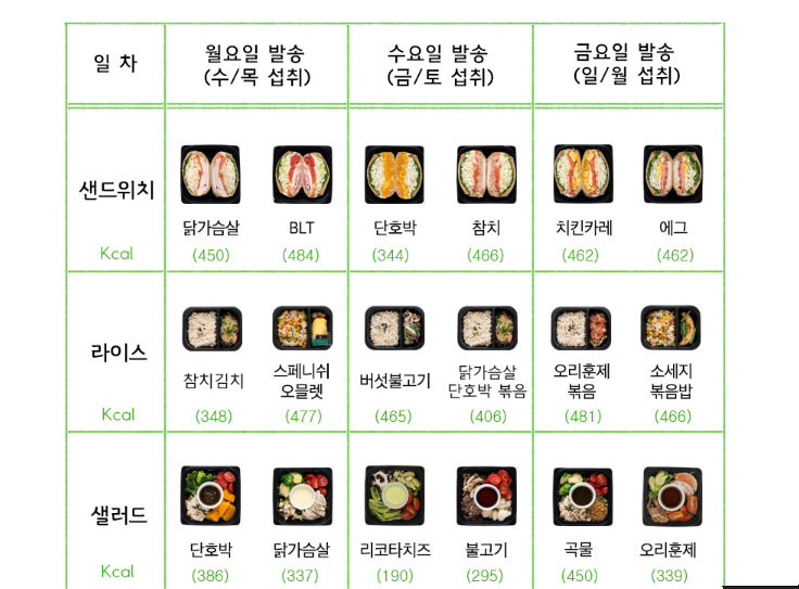 새롬 하루 세 끼 다이어트 프로그램은 샐러드+라이스+샌드위치로 구성된다.다이어트할 때 가장 참지 못하는 것이 음식의 양 조절인데 새롬데이엣 식단표를 보면 하루 세 끼를 먹어도 총 1200칼로리로 끼당 최대 500칼로리를 넘지 않는다. 이렇게 먹으면 살이 빠질 것 같은데..(웃음)