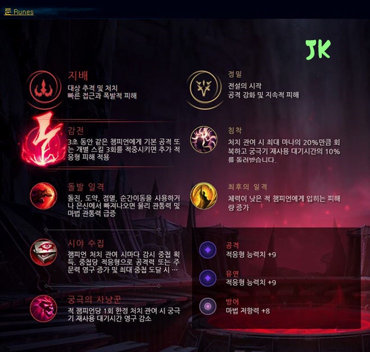 리그 오브 레전드를 주로 하는 분들이 찍는 룬은 정밀+지배입니다. 집중 공격에 의해 추가 데미지를 넣는 형태로 라인전에서 우위를 가져오는 방식입니다. 그리고 지배적이고 비열한 한방을 찍어 스턴을 넣어 피해를 주면 추가적인 고정 피해를 줄 수 있지만 상대의 조합이 성장형이 아닌 초반 갱단에서 해결해 나가는 챔피언이라면 좀비 워드를 찍는 것을 추천합니다.